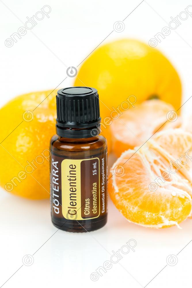 Clementine essential oil in 15ml bottle and pile of citrus fruits on white background, macro