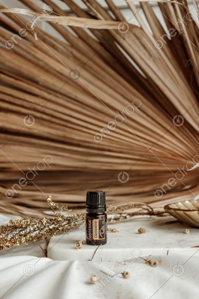 Photograph of the Clementine 5ml standing on marble board with dried flowers and dried palm leaf. Natural, bright, warm.