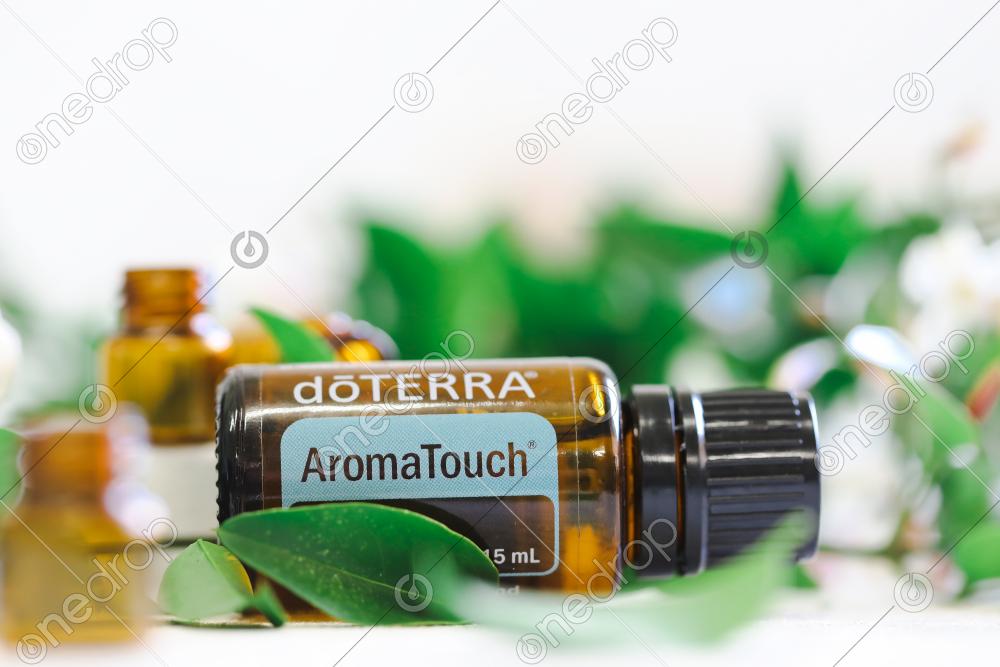 Close up image of AromaTouch surrounded by fresh leaves and 1ml sample drams