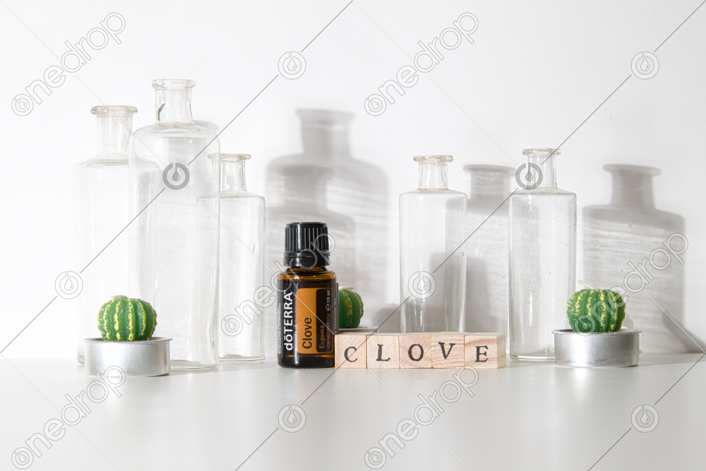 High-resolution image of Clove 15 mL oil bottle on a white background and glass bottles