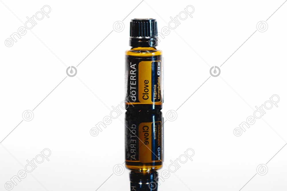 High-resolution photo with Clove 15mL oil bottle on a mirrored surface.