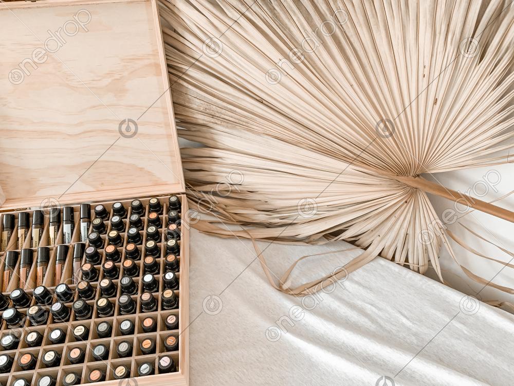 Collection of Essential Oils and Roller Bottles in a Wooden Storage Box
