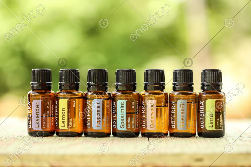 Collection of oils with vibrant natural blurred outdoor background