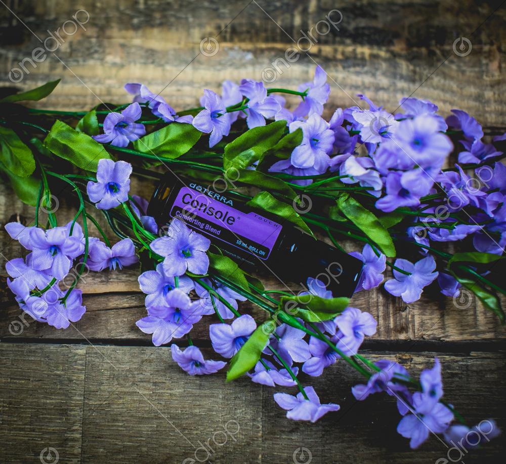 High Resolution image of Console Touch with purple flowers and rustic wood.