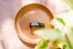 Copaiba Oil 15 ML on Linen and Copper Background with Sunlight and Plant.