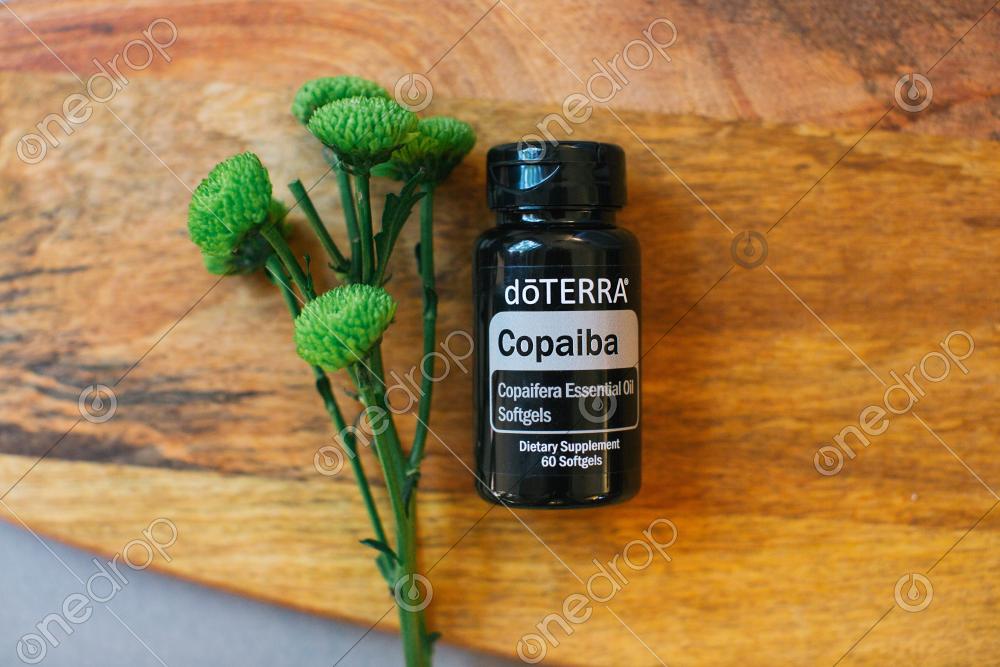 High-resolution photograph of Copaiba Softgels. Horizontal orientation with room for cropping and text if desired. Great for use with Social Media!