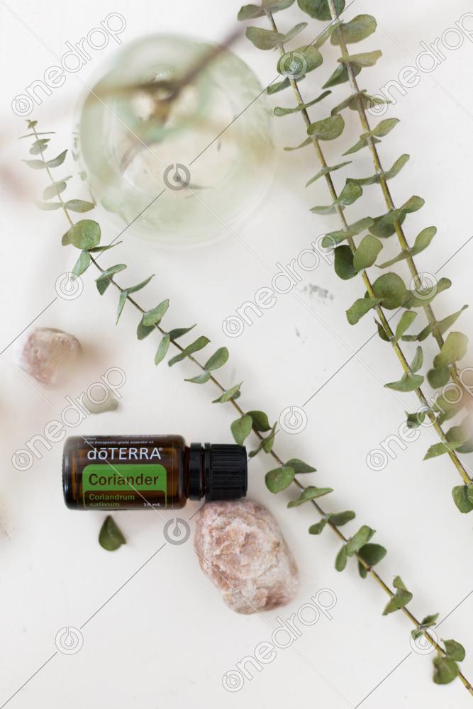High resolution photograph of Coriander essential oil which is commonly used in cooking. Earthy, rustic and boho style flat lay of essential oils on a rustic white table with rocks, vases, dried flowers and greens.