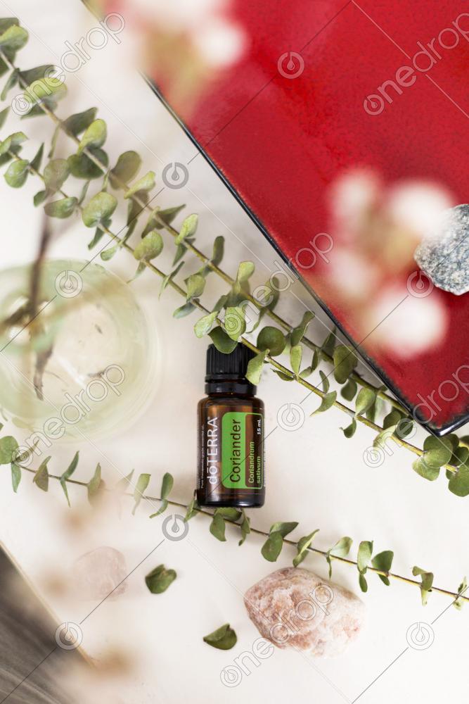 High resolution photograph of Coriander essential oil which is commonly used in cooking. Earthy, rustic and boho style flat lay of essential oils on a rustic white table with rocks, vases, dried flowers and greens.