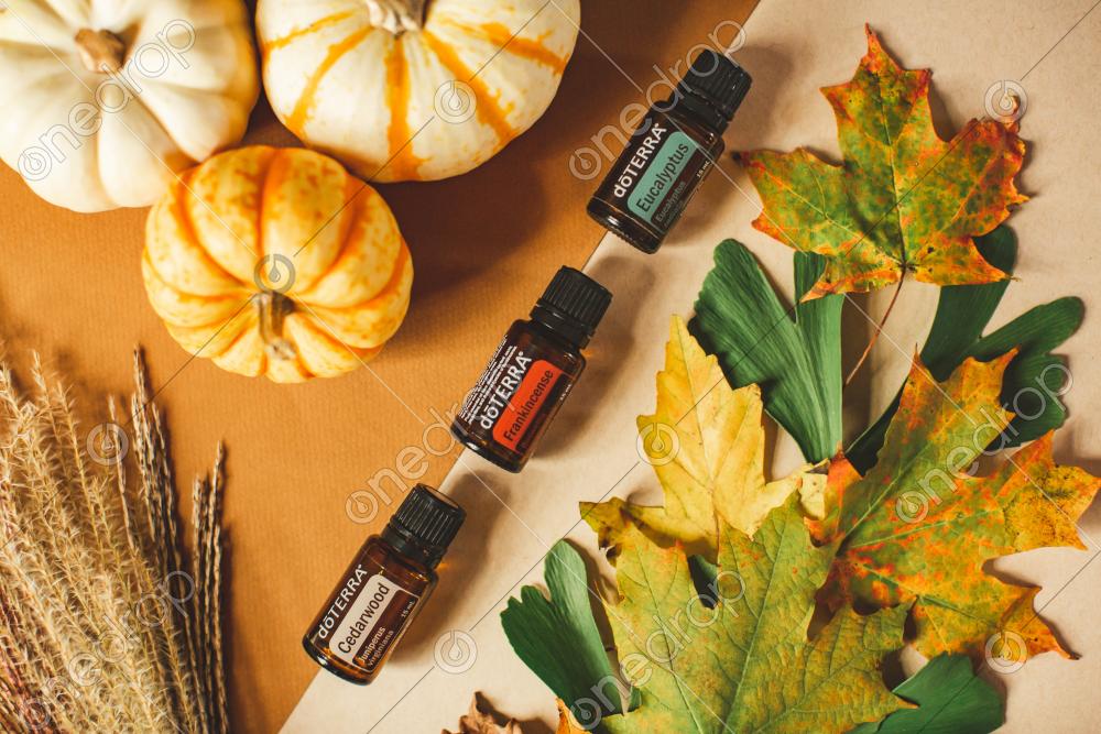 Fall Diffuser Blend - Crunchy Leaves, includes Frankincense, Cedarwood, and Eucalyptus. High-resolution photograph, horizontal orientation, with room for cropping and text if desired.