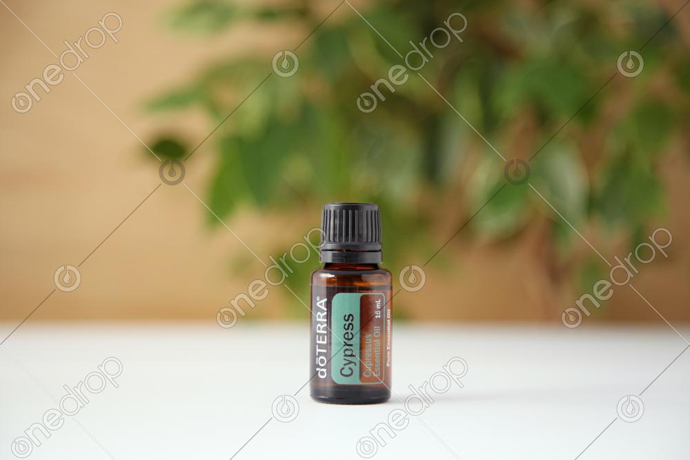 Cypress 15ml Bottle with Green Leaf and Wooden Background