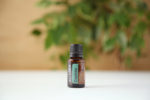 High-Resolution product photograph of Cypress 15ml bottle with a green leaf and wooden background.