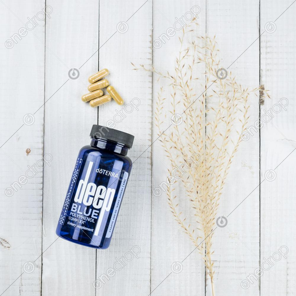 dōTERRA Deep Blue Polyphenol Complex flat lay on white wood with greenery