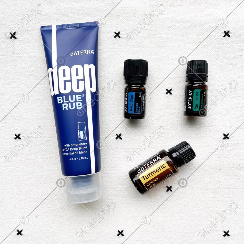 Features Deep Blue Rub, Deep Blue (5ml), Turmeric (15ml) & Ravintsara (5ml) in a Flat Lay.