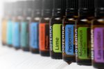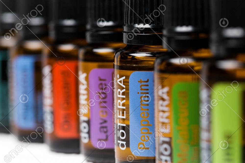 Different essential oils, bottles in row, focus on dōTERRA Peppermint oil