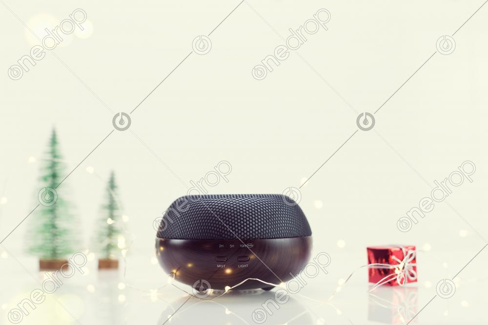 Diffuser Brevi on white table with Christmas decorations on background, toned image