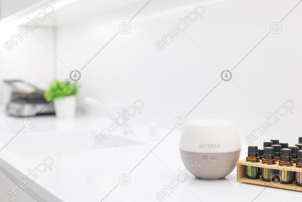 Diffuser Petal 2.0 with oils collection at storage tray on countertop at kitchen interior, copy space for your text