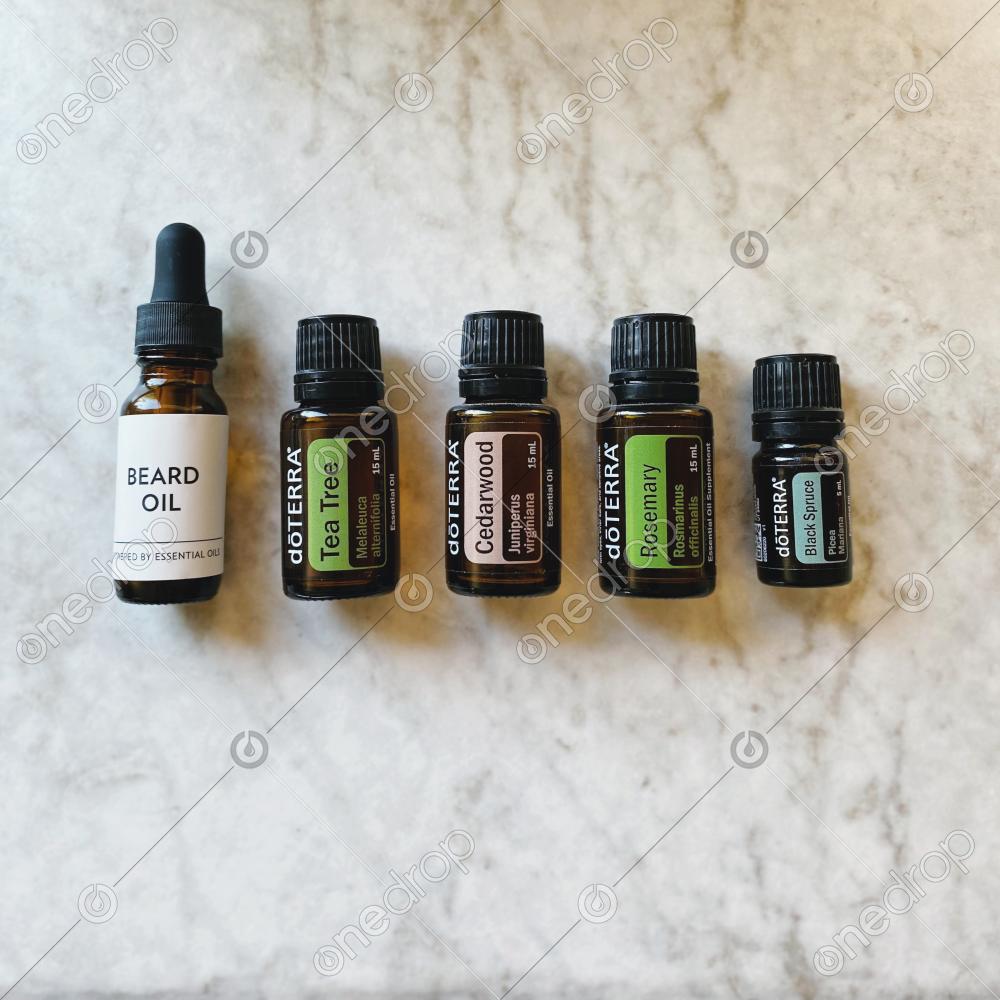 An image with beard oil, tea tree, cedarwood, rosemary and black spruce.