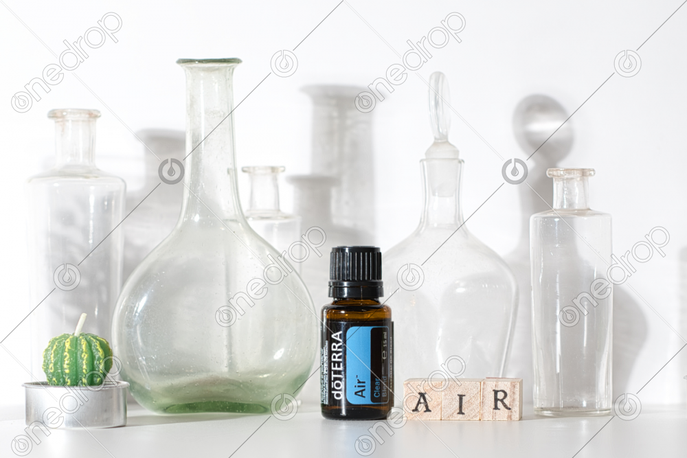 High-resolution image of dōTERRA Air™ 15 mL oil bottle on a white background and glass bottles