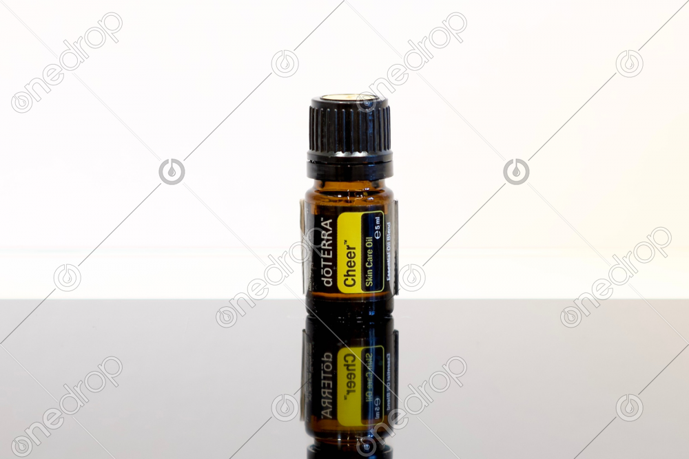 High-resolution photo with dōTERRA Cheer™ 5mL oil bottle on a mirrored surface.