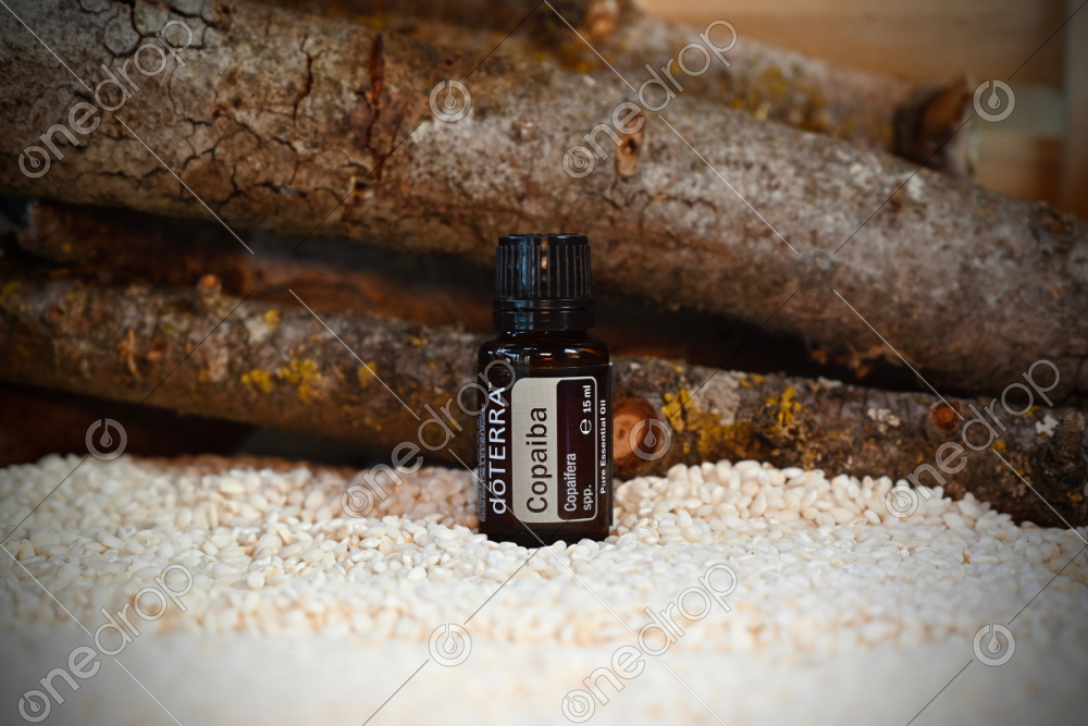High-resolution of Copaiba 15 ml bottle on a woody and outdoor background