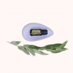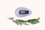 A high-res flatlay image of a 15ml bottle of Lemongrass oil, sitting on top of a pretty shell shaped dish, with gold edging. A sprig of green foliage sits underneath the product/dish. There is plenty of space to add your own text, if you wish.