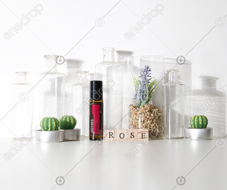 High-resolution image of dōTERRA Rose Touch10 mL roll-on on a white background and glass bottles