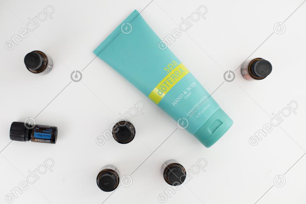 High resolution horizontal .jpg image of dōTERRA Spa Hand & Body Lotion with several oil bottles on a white background.