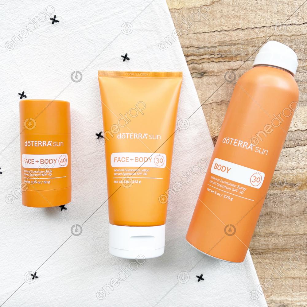 Features the dōTERRA Sun Line Collection: dōTERRA Sun Face + Body Mineral Sunscreen Lotion, dōTERRA Sun Face + Body Mineral Sunscreen Stick, dōTERRA Sun Body Mineral Sunscreen Spray in a Flat Lay.