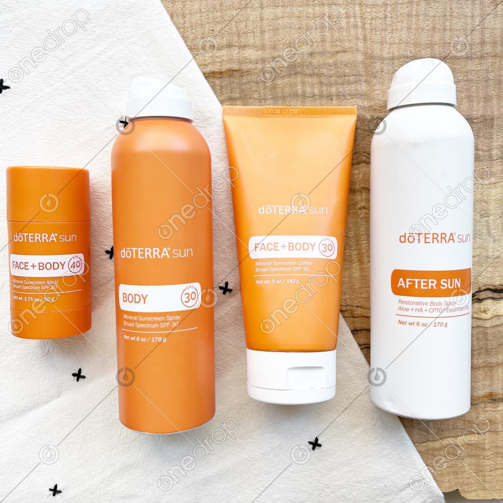 Features all of the products in the dōTERRA Sun Line Collection: Face + Body Mineral Sunscreen Stick, Body Mineral Sunscreen Spray, Face + body Mineral Sunscreen Lotion, & the After Sun Restorative Body Spray in a Flat Lay.