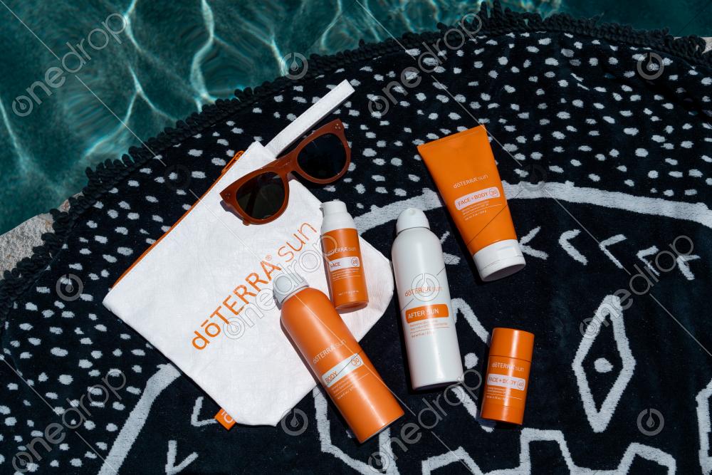 A photograph of the best sunscreen line, DoTerra Sun. All 5 products are a must for the whole family in the sunshine. In this image they are laying on a towel next to the pool on a sunny day.