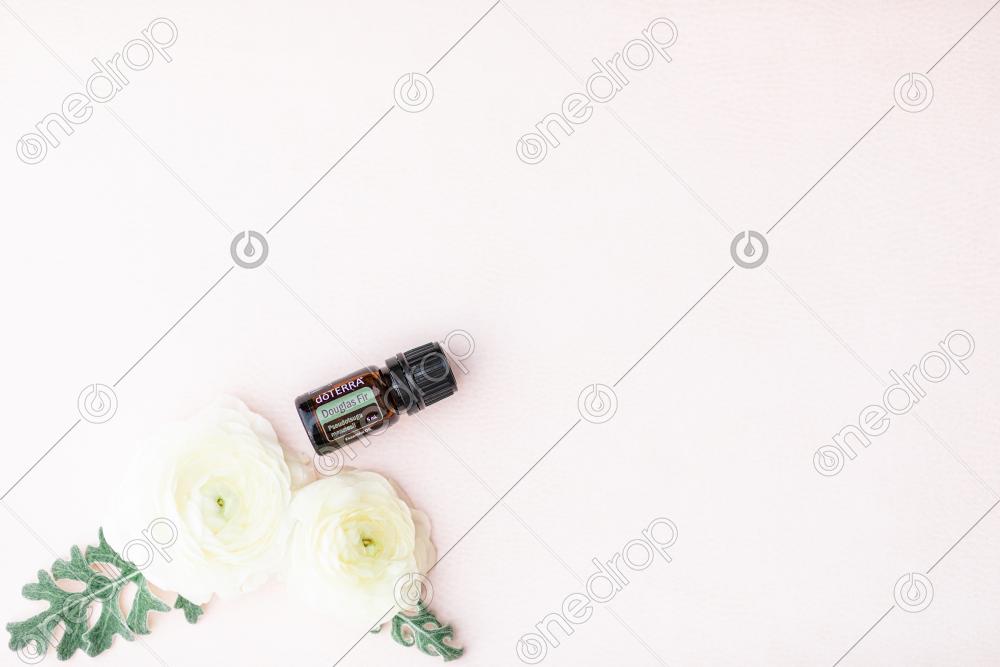 Douglas Fir 5 ml on pink background with white flowers and leaves. Blank space can be used to add text or high resolution image can be cropped creatively for Instagram, Facebook, or social media.
