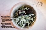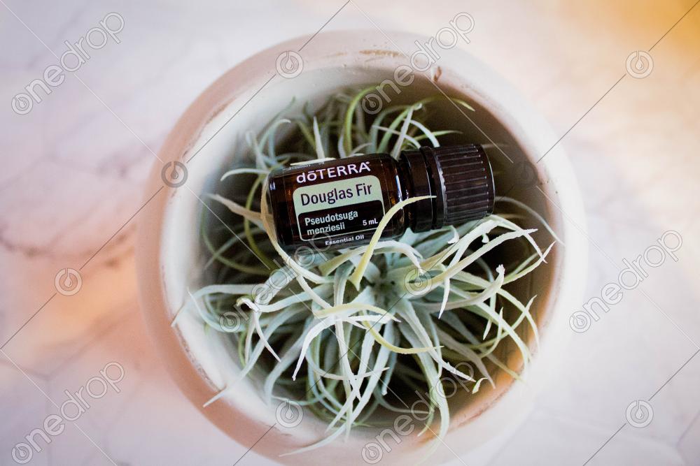 This photo features a 5 ml bottle of Douglas Fir in cement pot with greenery on white marble tile
