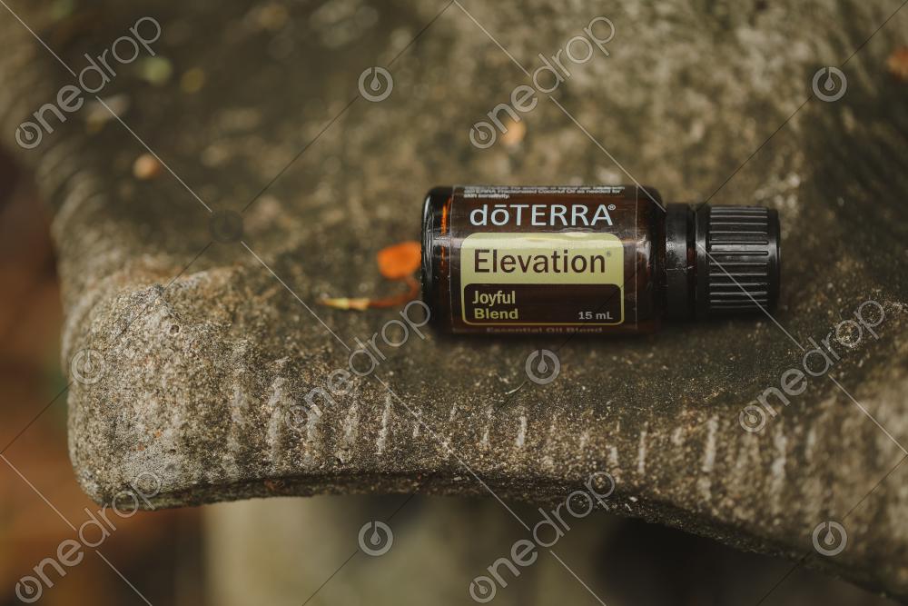 A high resolution image of Elevation - Joyful Blend - 15ml bottle on ceramic statue.