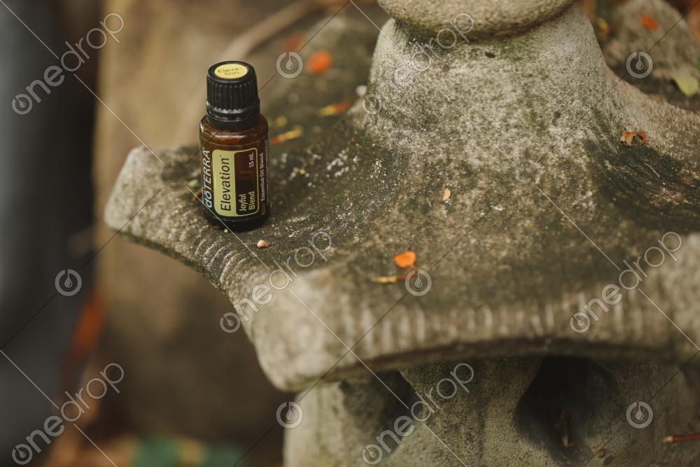 A high resolution image of Elevation - Joyful Blend - 15ml full sized bottle on ceramic statue.