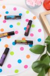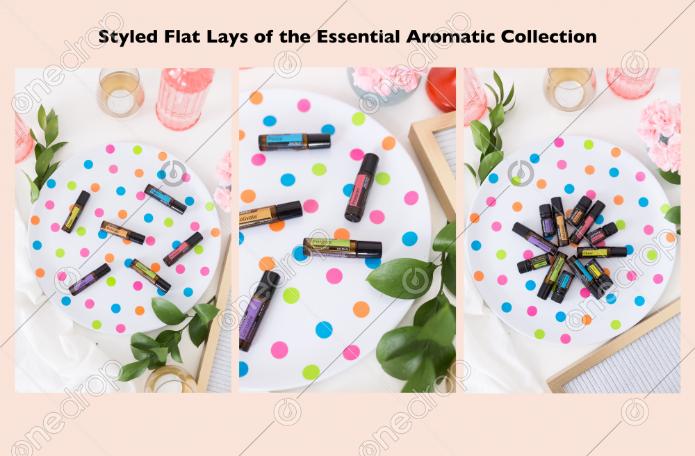 Styled product photos of the emotional aromatherapy oils in rollers and in 5 ml bottles. Fun, bright, and cheery.