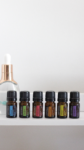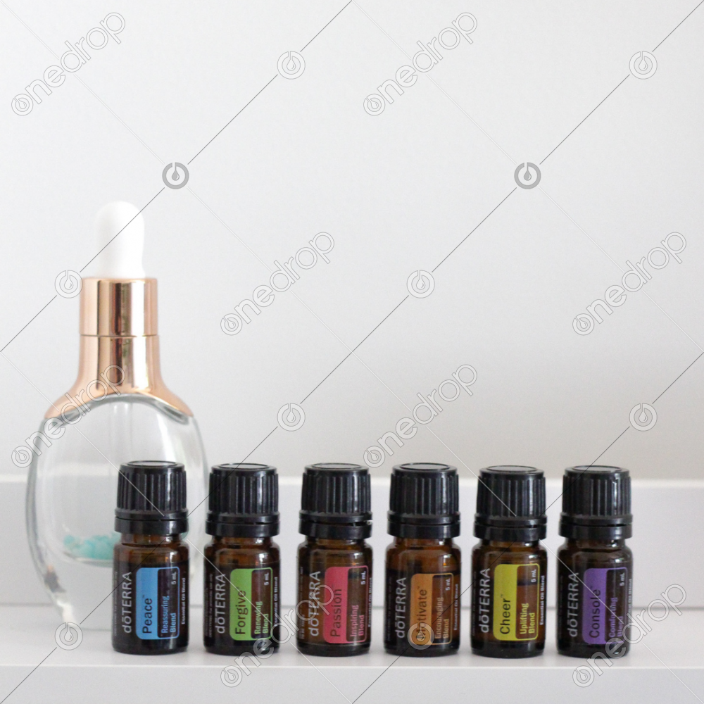 Image with all 6 emotional aromatherapy oils on a white shelf with a gold topped decorative dropper.