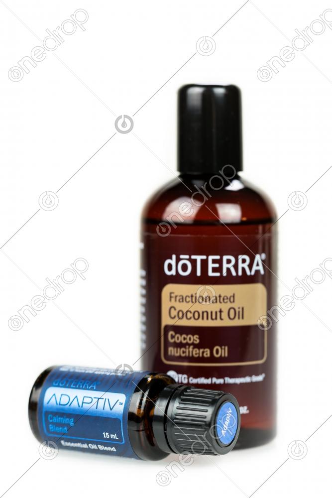 Essential calming blend Adaptiv and bottle with Fractionated Coconut Oil bottle isolated on white background