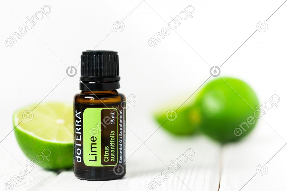 Bottle with essentil oil Lime on white wooden background with fresh lime fruits