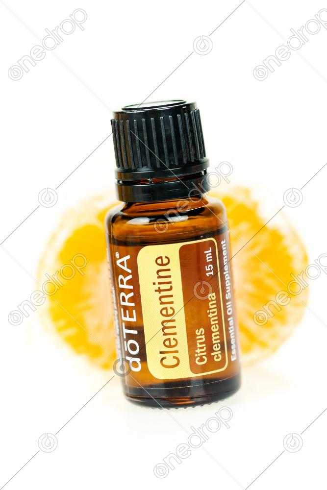 Essential oil Clementine in 15ml bottle in citrus fruit background