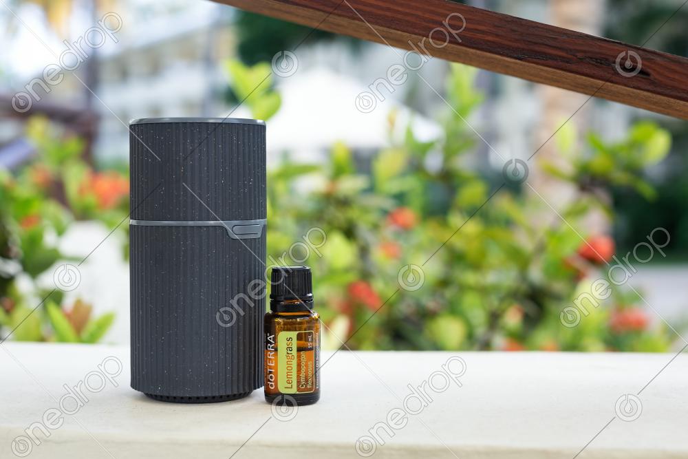 Bottle with essential oil Lemongrass with diffuser Pilot on tropical natural background