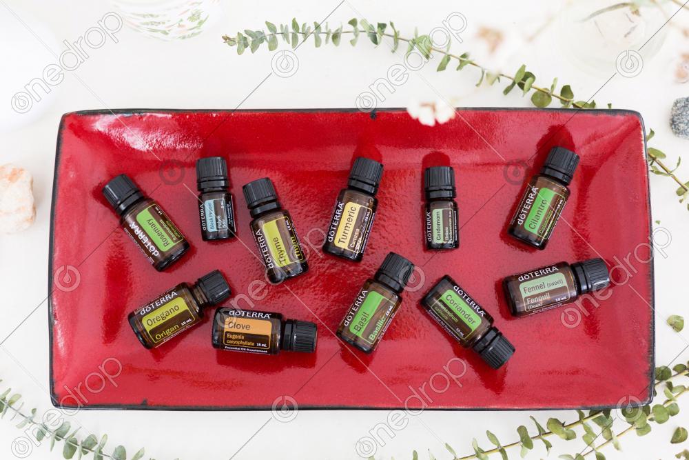 High resolution photograph of essential oils commonly used in cooking. Earthy, rustic and boho style flat lay of essential oils on a red plate with rocks, vases, dried flowers and greens.