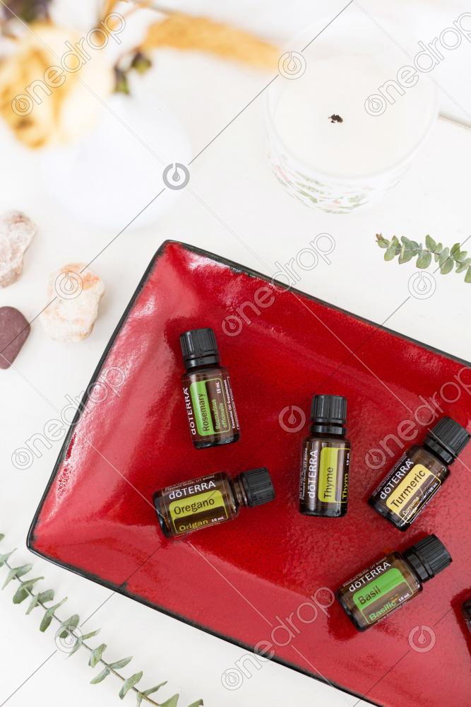 High resolution photograph of essential oils commonly used in cooking. Earthy, rustic and boho style flat lay of essential oils on a red plate with rocks, vases, dried flowers and greens.