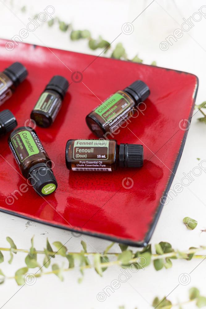 High resolution photograph of essential oils commonly used in cooking. Earthy, rustic and boho style flat lay of essential oils on a red plate with rocks, vases, dried flowers and greens.