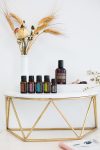 Styled photo of top essential oils for skin & body with dōTERRA's fractionated coconut oil. Geranium, Frankincense, Aromatouch, Bergamot, Hawaiian Sandalwood.