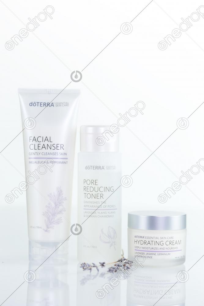 Facial Cleanser, Pore Reducing Toner and Hydrating Cream close up on white background, decorated lavender flower.