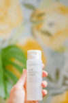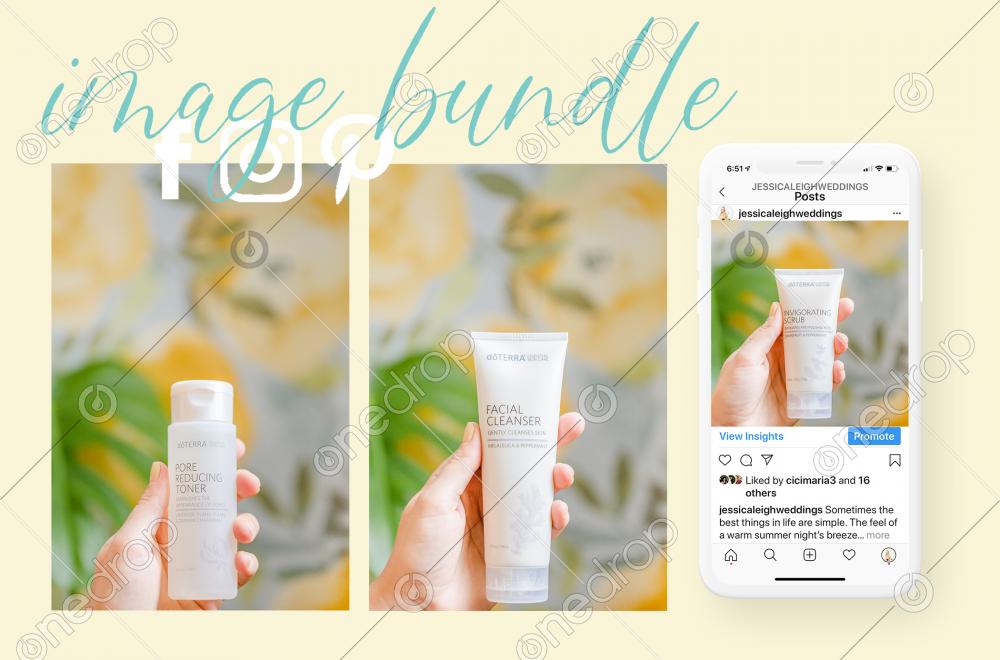 Essential Skin Care Facial Cleanser, Pore Reducing Toner, & Invigorating Scrub photo bundle on yellow flower background with yellow flowers and leaves. Blank space can be used to add text or high resolution image can be cropped creatively for Instagram, Facebook, or social media.