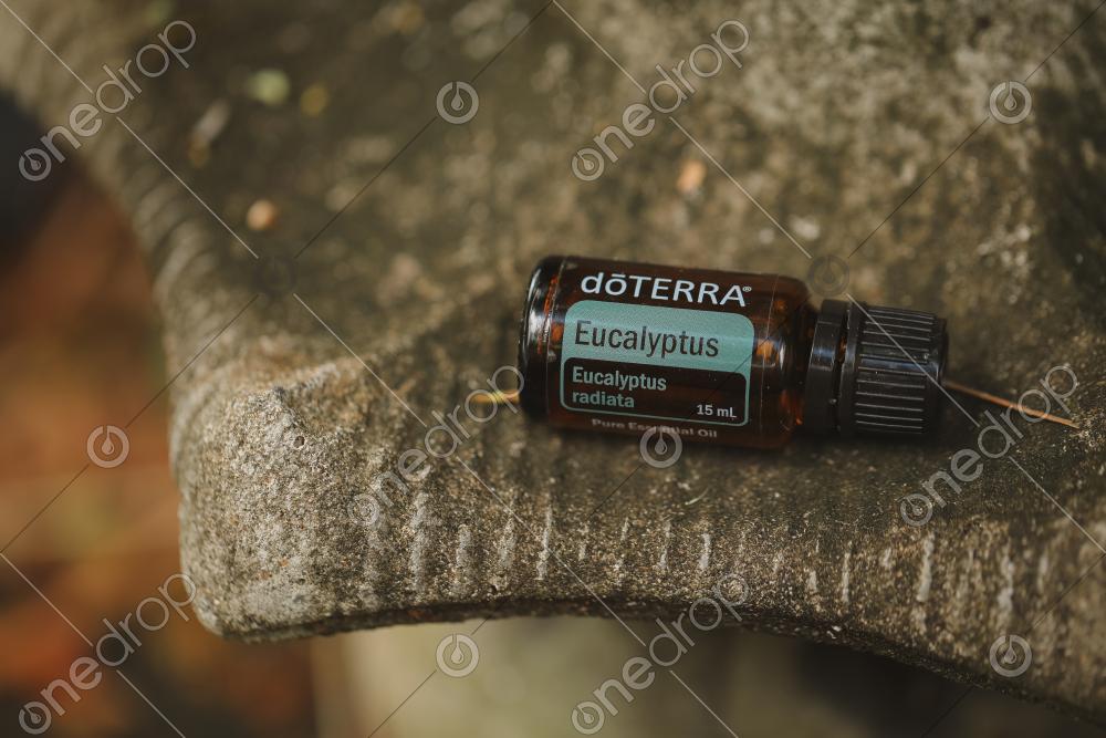 A high resolution image of Eucalyptus - The Oil of Wellness - 15ml full sized bottle on ceramic statue.