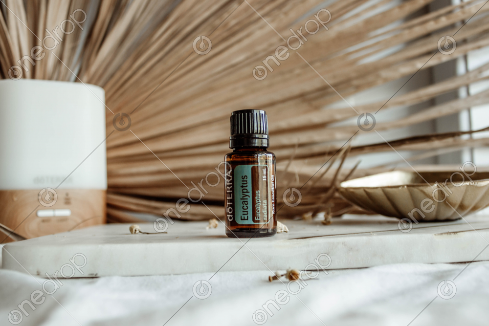 High Res image of Eucalyptus standing on a marble board with Lumo diffuser, dried palm leaf in background.