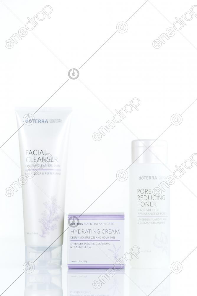Essential Skin care, Facial Cleanser, Pore Reducing Toner and Hydrating Cream in box on white background