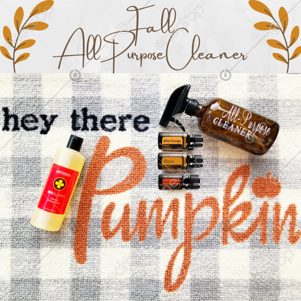 Image of glass spray bottle, On Guard concentrate, cinnamon, wild orange and clove with "hey there Pumkin."